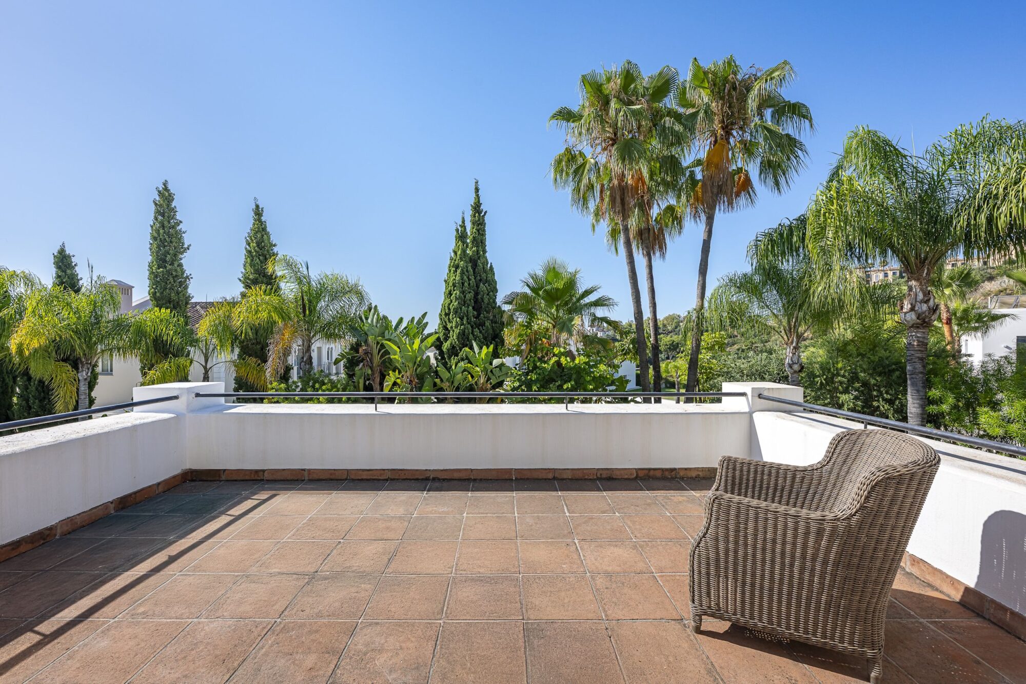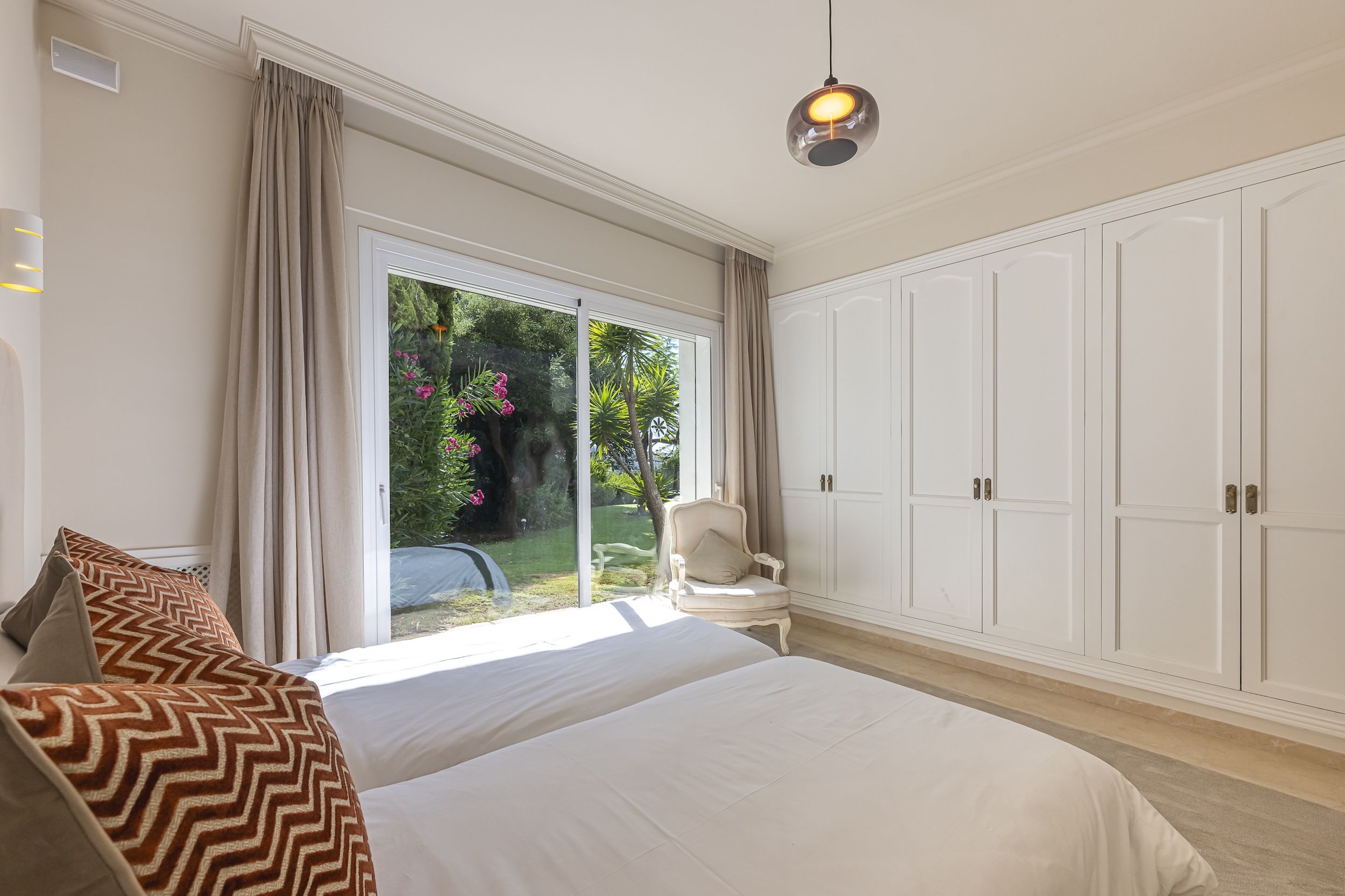 The main house features four generous en-suite bedrooms. Three are located on the upper floor, each with access to a private terrace overlooking the gardens and golf course. The fourth bedroom is situated on the ground floor, ideal for guests or those seeking easy access to the outdoor areas. The main living spaces are bright and inviting, with a contemporary furnished living room and an additional sitting room, both opening directly onto the terraces through expansive windows that maximise natural light.