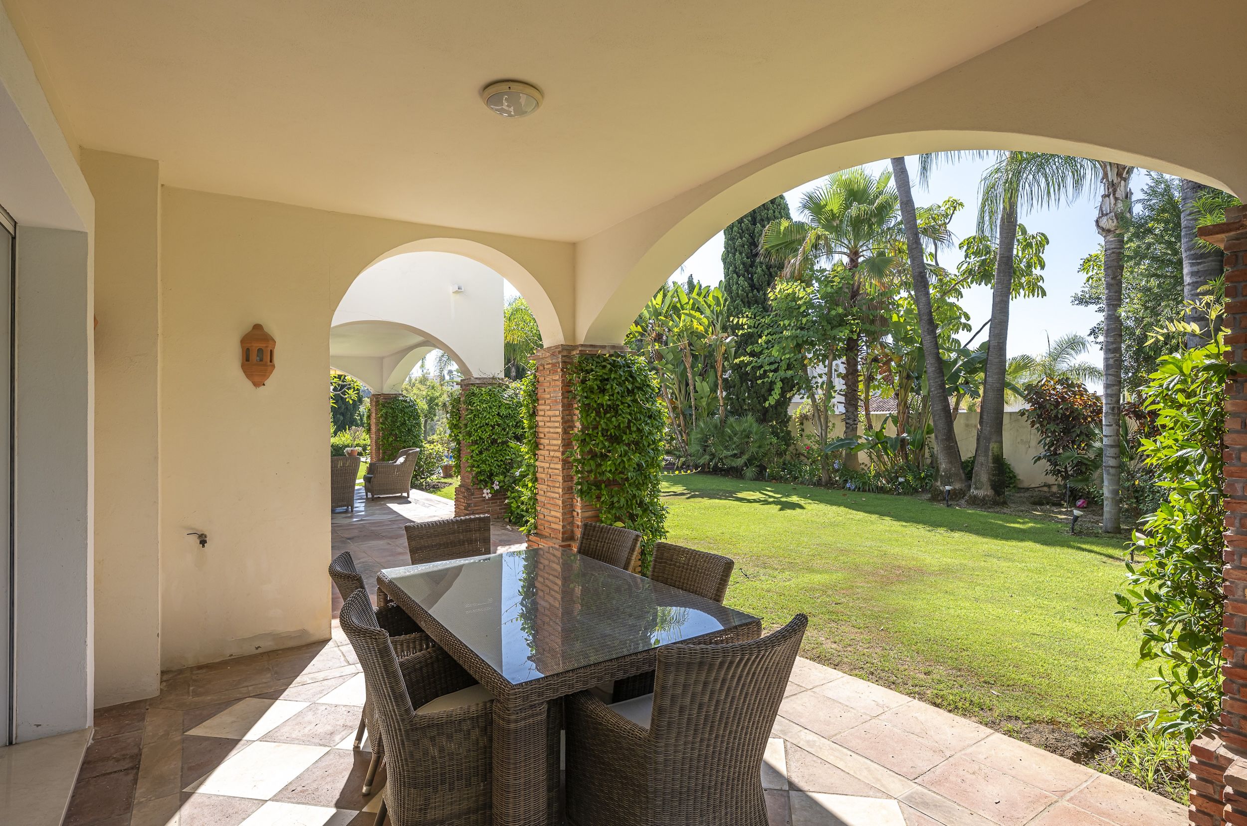 Outdoors, the property truly excels. The 1,400 m² plot features a mature garden with automatic irrigation, natural shaded areas beneath established trees, and a private heated swimming pool for year-round enjoyment. Multiple covered and open terraces provide ideal settings for sunny breakfasts, relaxed afternoons, or elegant evenings overlooking the expansive golf landscape.