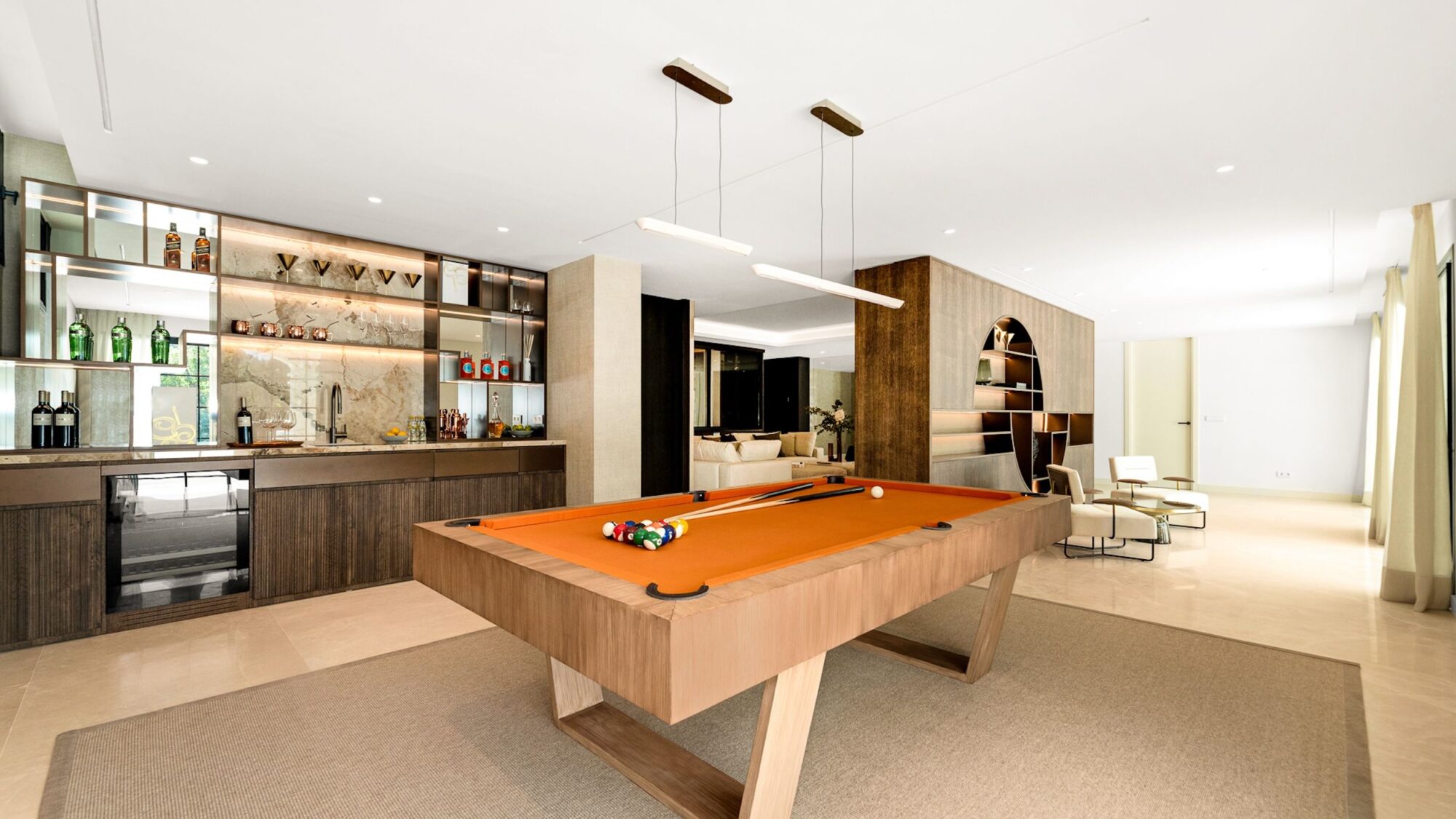 Wellness and leisure are woven into the fabric of the home. A dedicated spa area includes a sauna, hammam and gym, offering the perfect private retreat. The upper terrace features a jacuzzi with far reaching panoramic views, ideal for enjoying Marbella’s golden sunsets. The entertainment level includes an elegant games room with billiard table, a bespoke bar and a temperature controlled wine display, creating an exquisite setting for intimate gatherings and relaxed evenings.