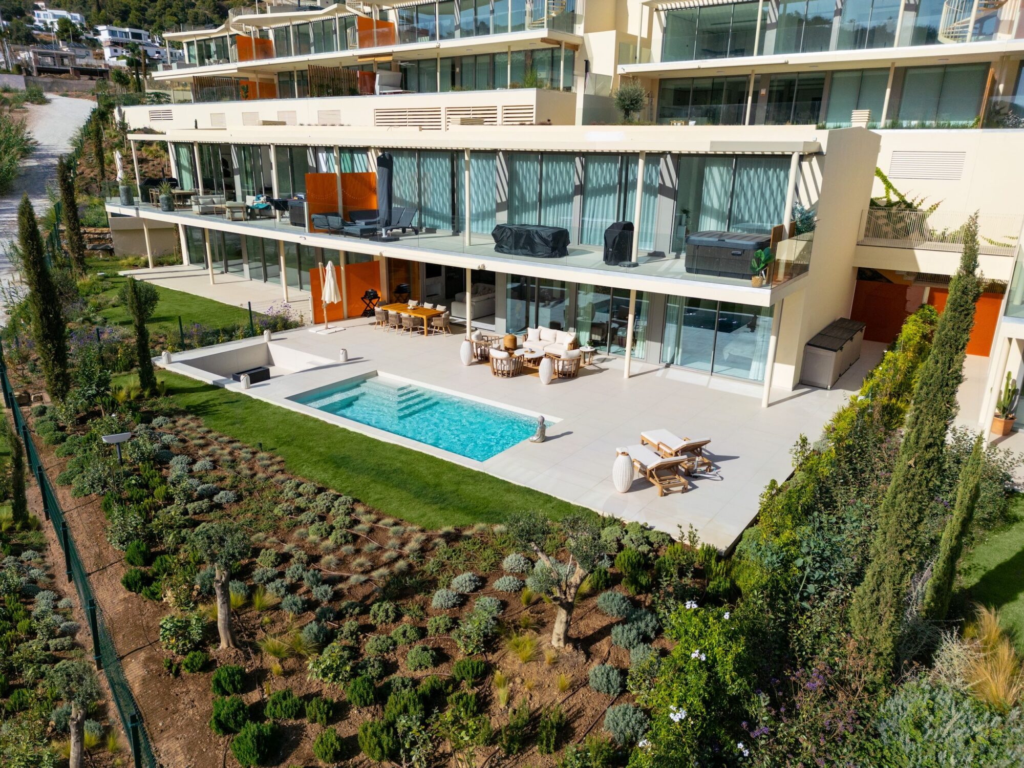 Positioned to capture uninterrupted sea and mountain views, the apartment has been thoughtfully designed to maximise privacy, light, and seamless indoor-outdoor living. The expansive terrace is the defining feature of the home, offering a private swimming pool, landscaped garden, and an integrated fire pit. This outdoor space functions as a natural extension of the interior living area, creating an ideal setting for entertaining, relaxation, and year-round enjoyment of the Mediterranean climate.