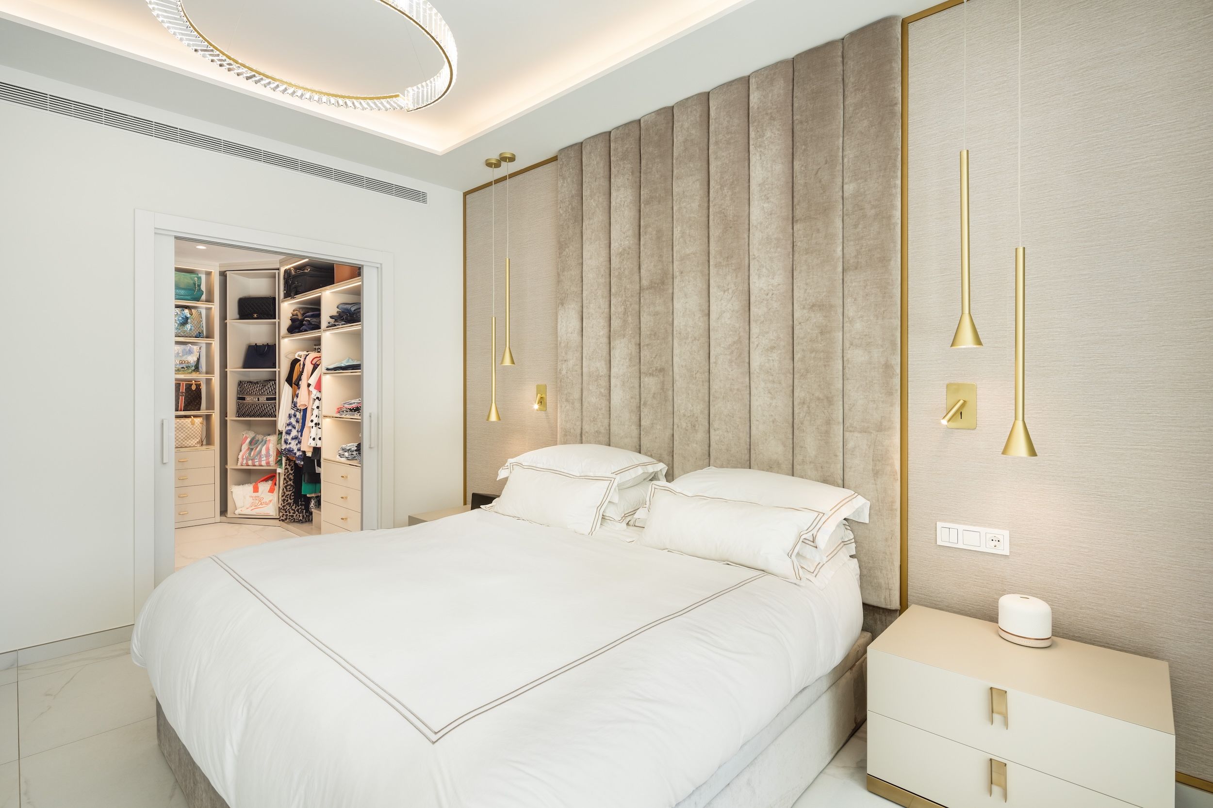 The interior reflects a refined contemporary aesthetic, fully custom designed by renowned interior designer Soledad Merchán. The open-plan living and dining area connects effortlessly with the terrace, while the modern kitchen is fully equipped with top-of-the-line appliances and bespoke finishes, combining functionality with understated elegance.