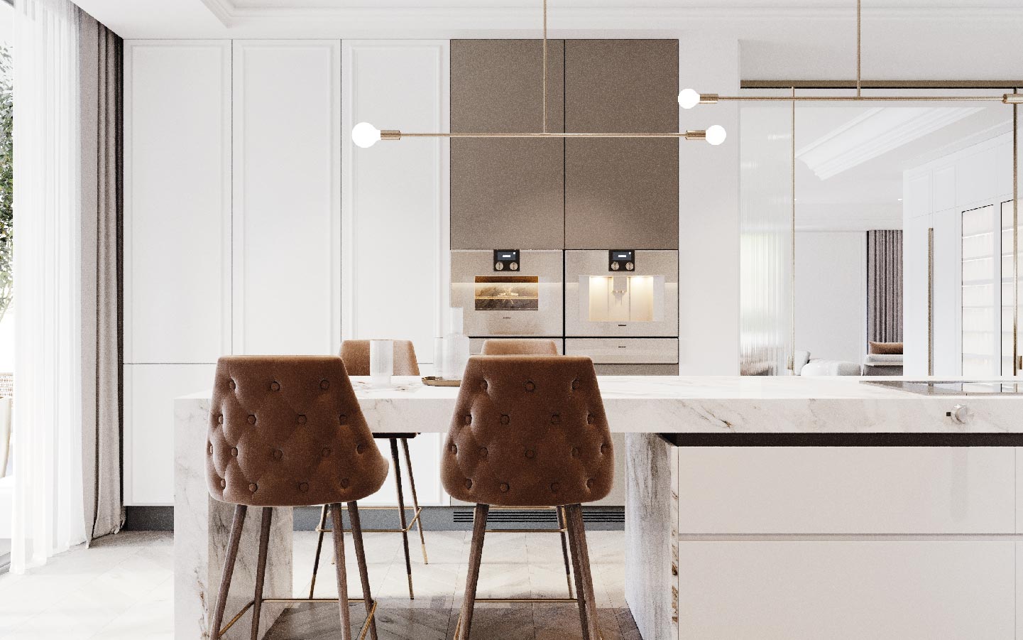 Upon arrival, a grand entrance with a water fountain and double-height pillars sets the tone for the home’s refined design. The main floor features open-plan living and dining areas, a statement fireplace, and a bespoke kitchen with top-of-the-line appliances and a custom island. Floor-to-ceiling glass doors open to expansive terraces, a manicured garden, and a heated saltwater pool with a chic hammock lounge area.