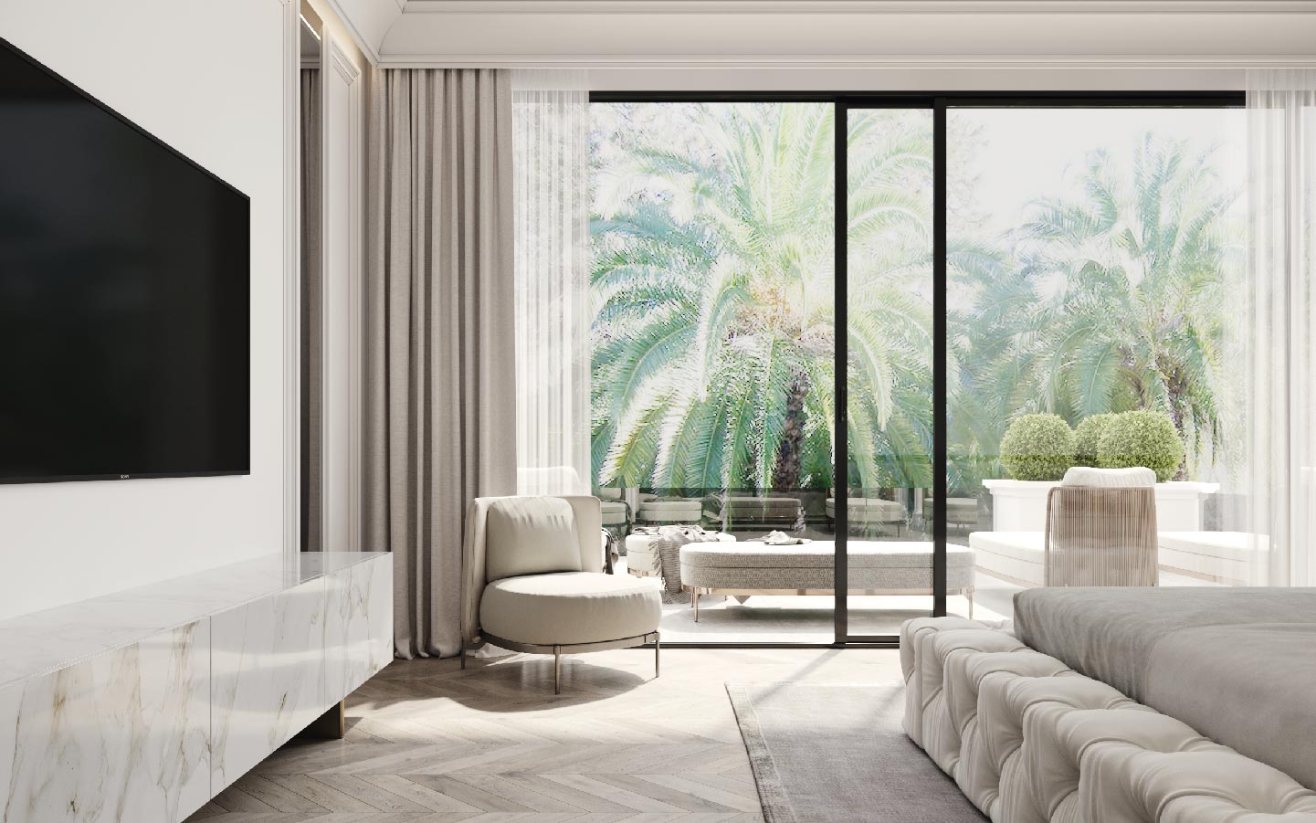 Topping off the villa is a designer rooftop solarium with space for a glass-enclosed outdoor gym, and elegant lounge areas—both covered and uncovered—with uninterrupted views of the Mediterranean.