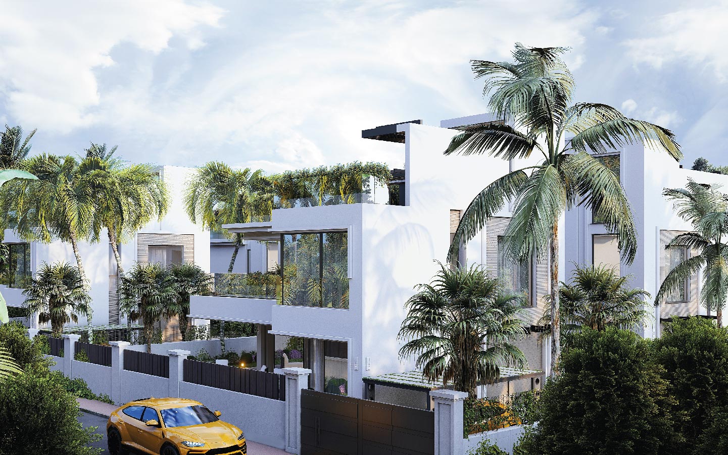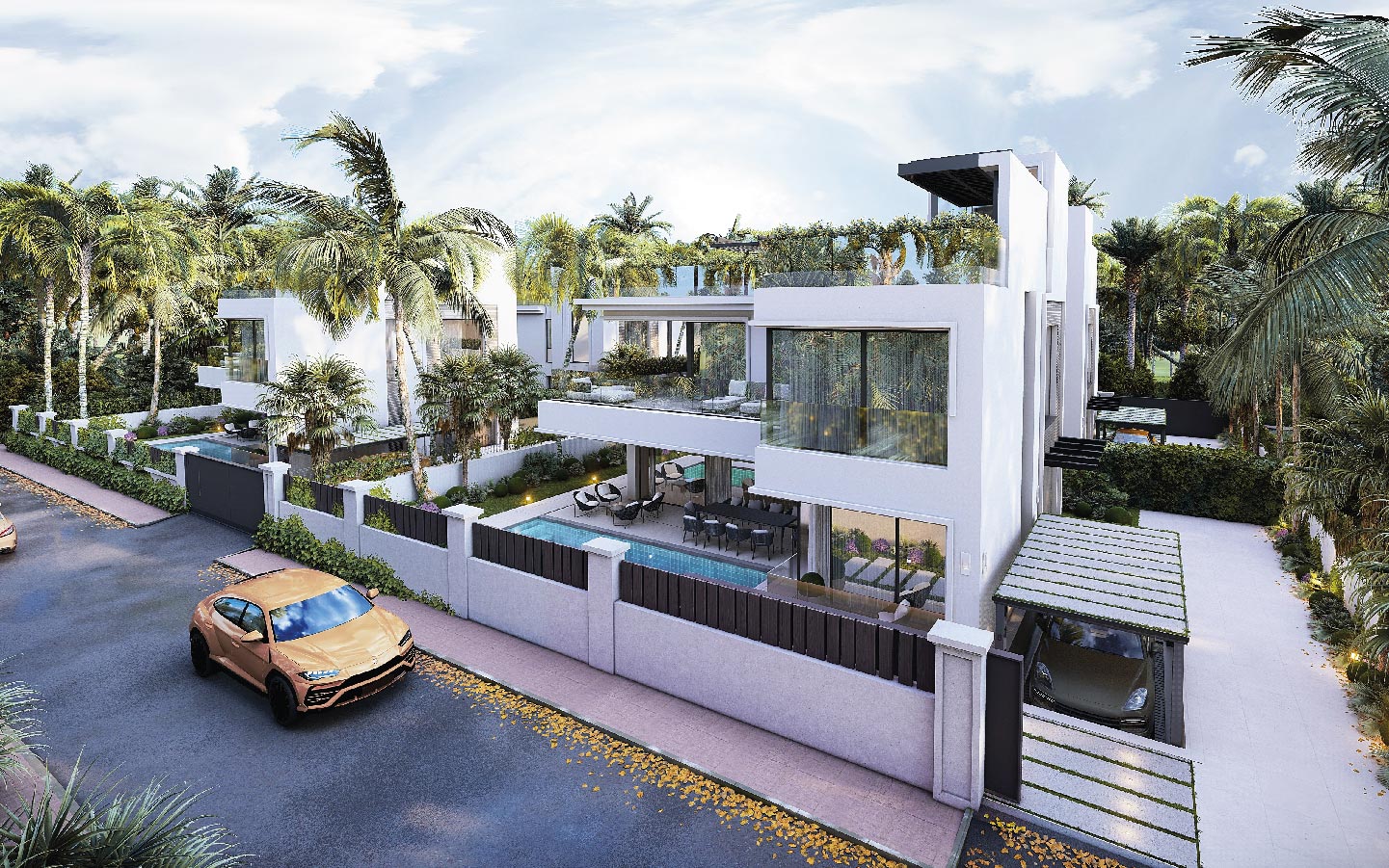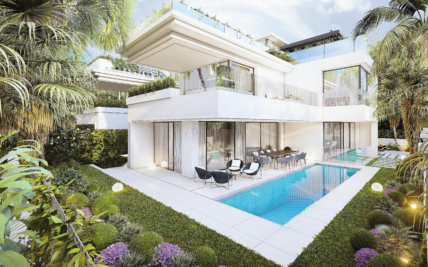 Modern 5-bedroom beachside villas for sale in Rio Verde, Marbella Golden Mile. Located just 100 meters from the sea, featuring private pools, rooftop terraces, a gym, cinema room, and walking distance to Puerto Banús and top amenities.