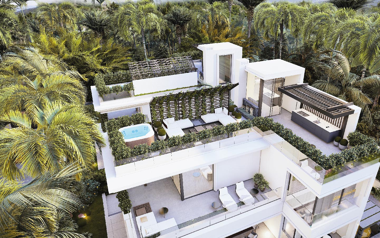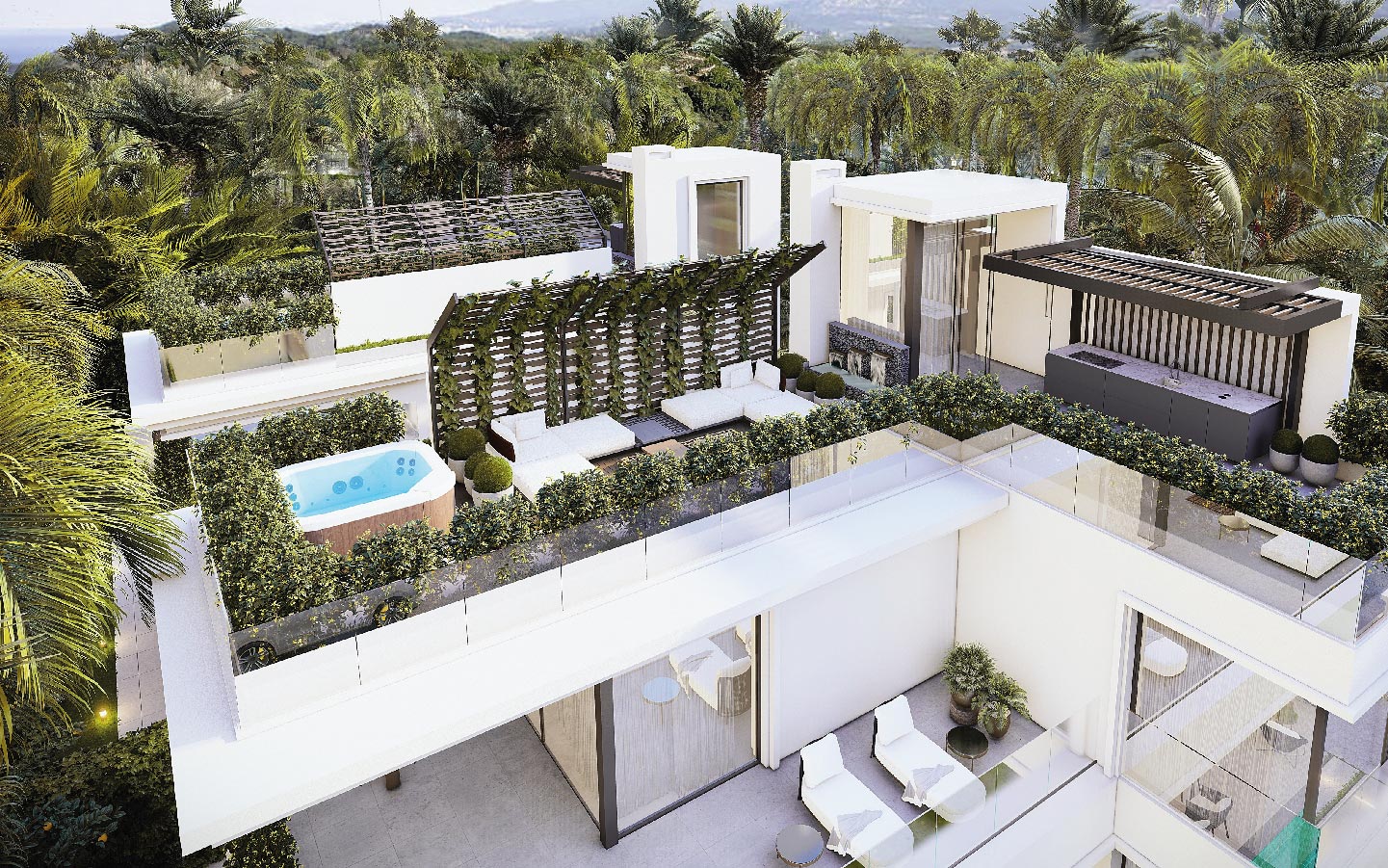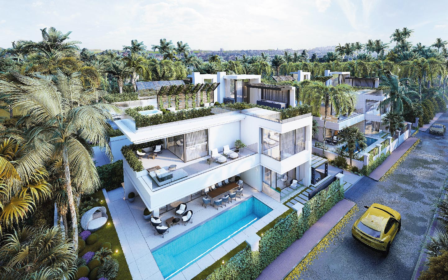 Modern 5-bedroom beachside villas for sale in Rio Verde, Marbella Golden Mile. Located just 100 meters from the sea, featuring private pools, rooftop terraces, a gym, cinema room, and walking distance to Puerto Banús and top amenities.