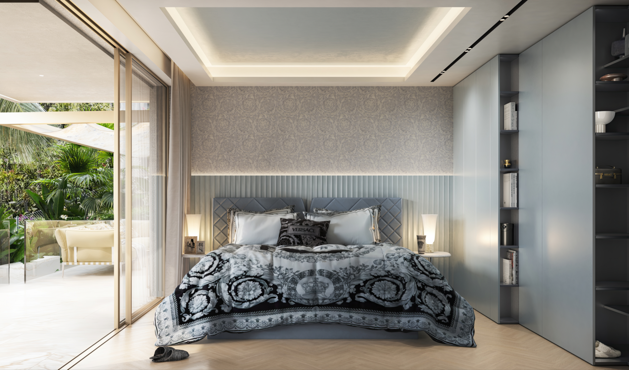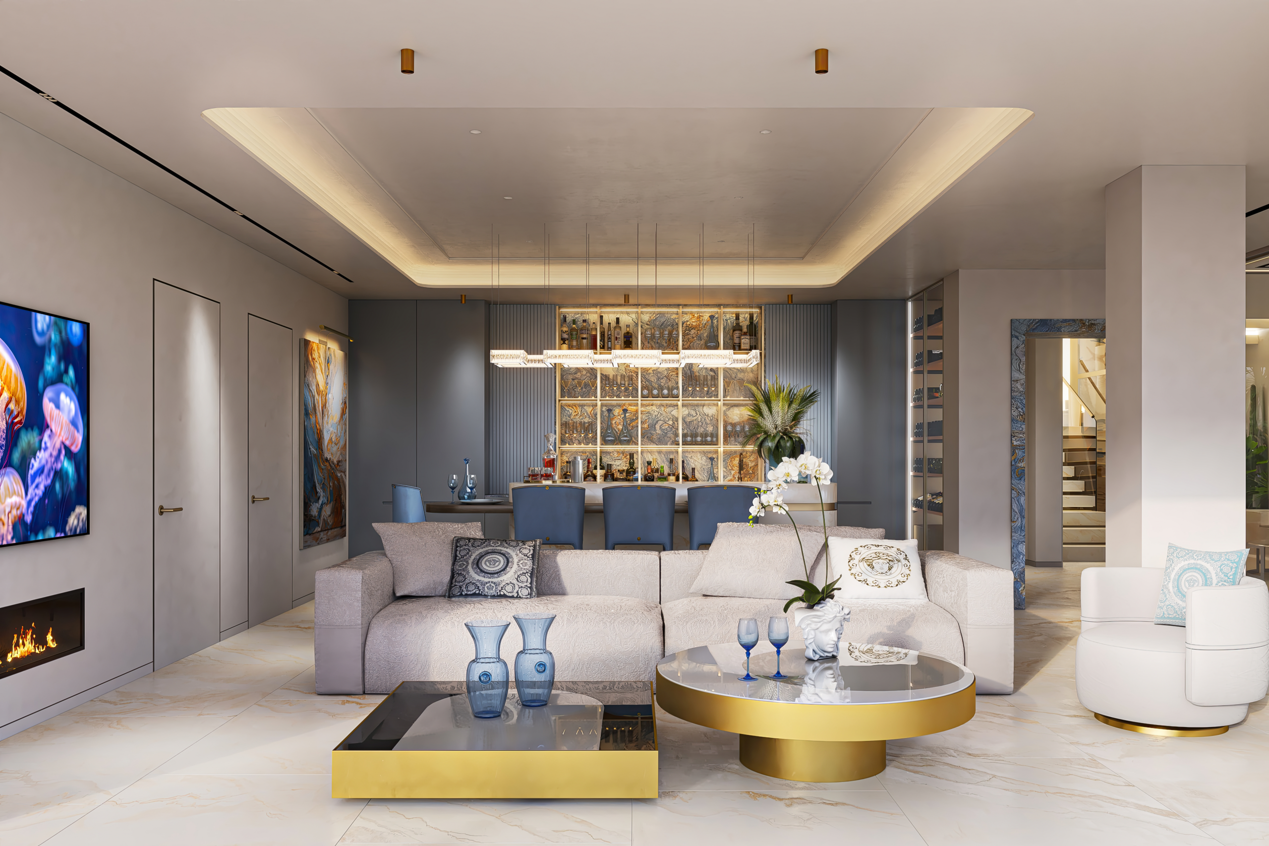 Each villa is conceived as an architectural jewel with its own identity, unified by Versace’s unmistakable design language. From the moment one enters, the influence of the Italian fashion house is evident in every detail. Signature Versace motifs such as Greca, Medusa, and Barocco are seamlessly integrated into mosaics, textiles, bespoke furnishings, and refined finishes, creating interiors that are both expressive and timeless.