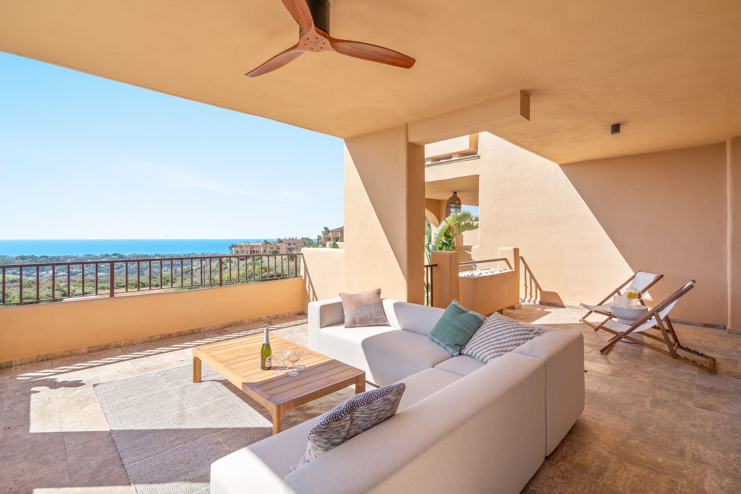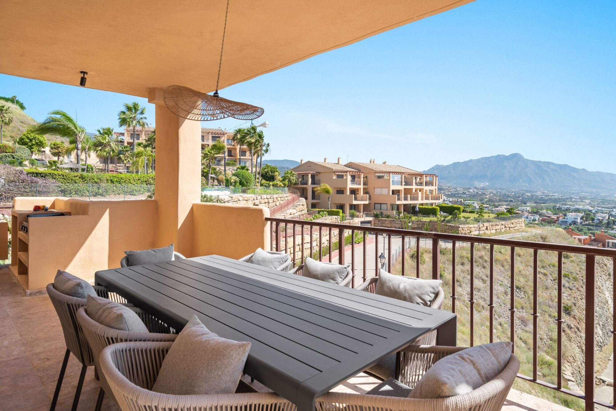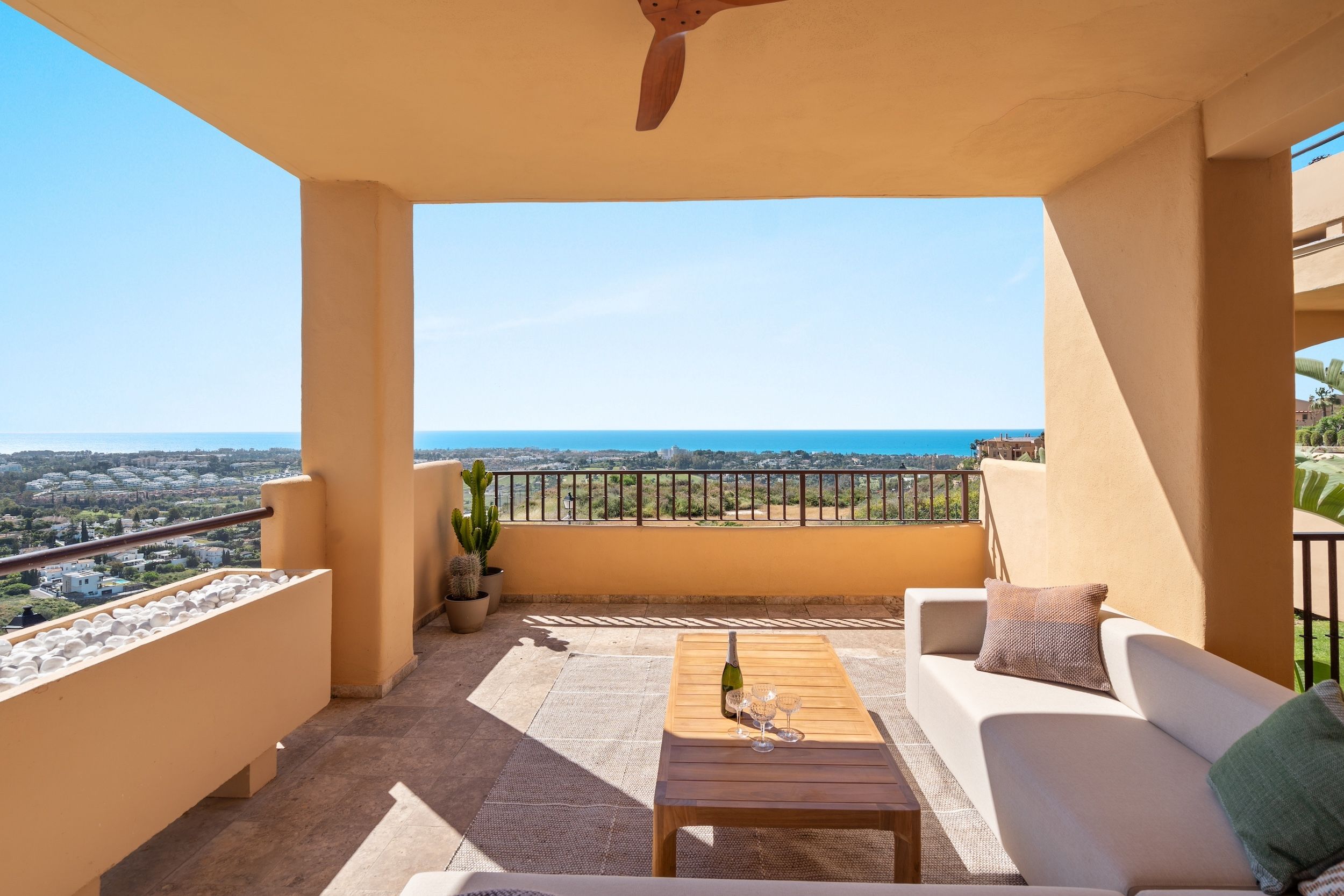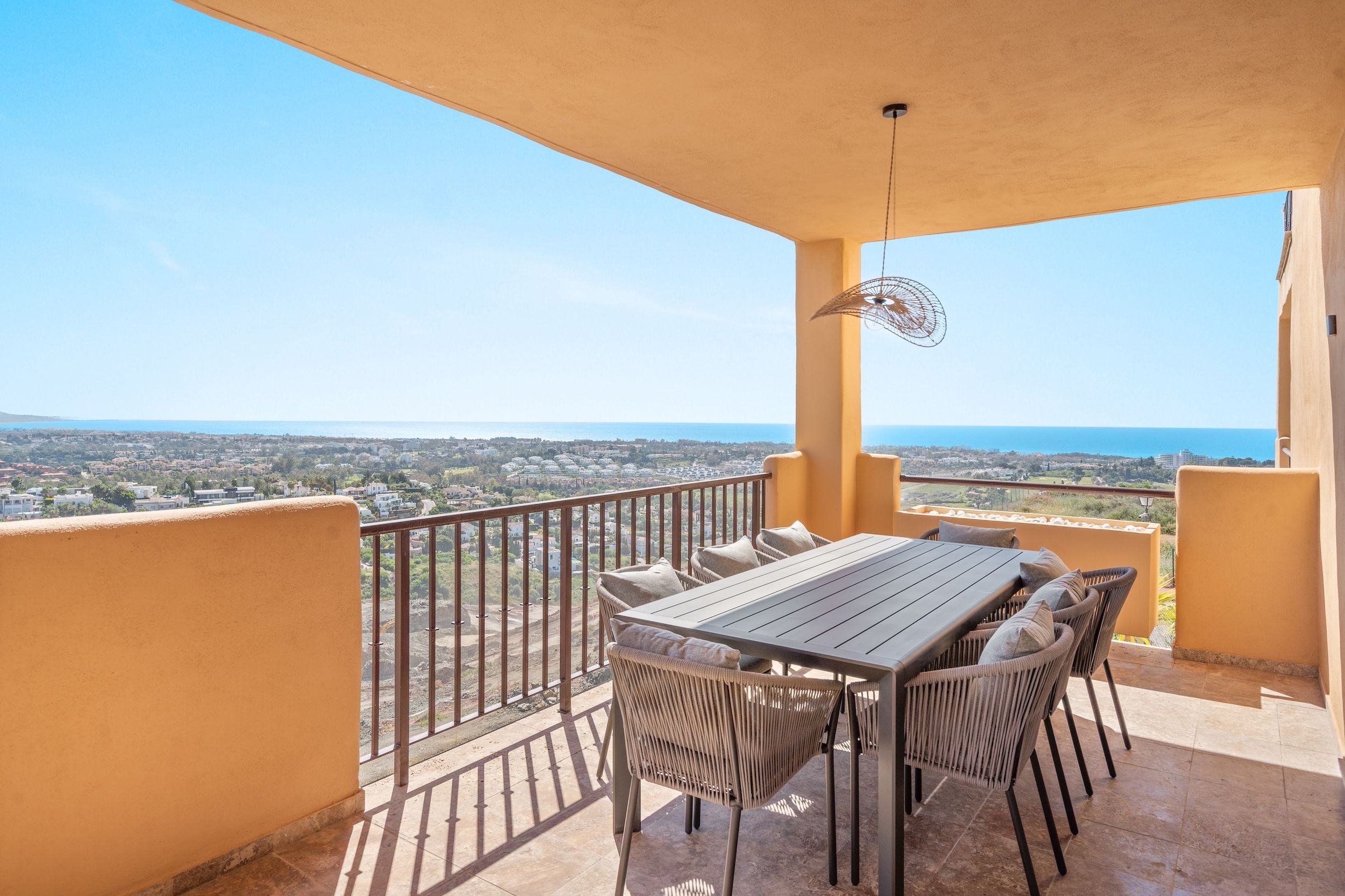 Experience breathtaking panoramic views from this fully renovated and beautifully furnished corner apartment in La Hacienda Benahavis. With 119m² of elegant living space and 58m² of sunlit terraces, this home is the perfect blend of design, comfort, and location.