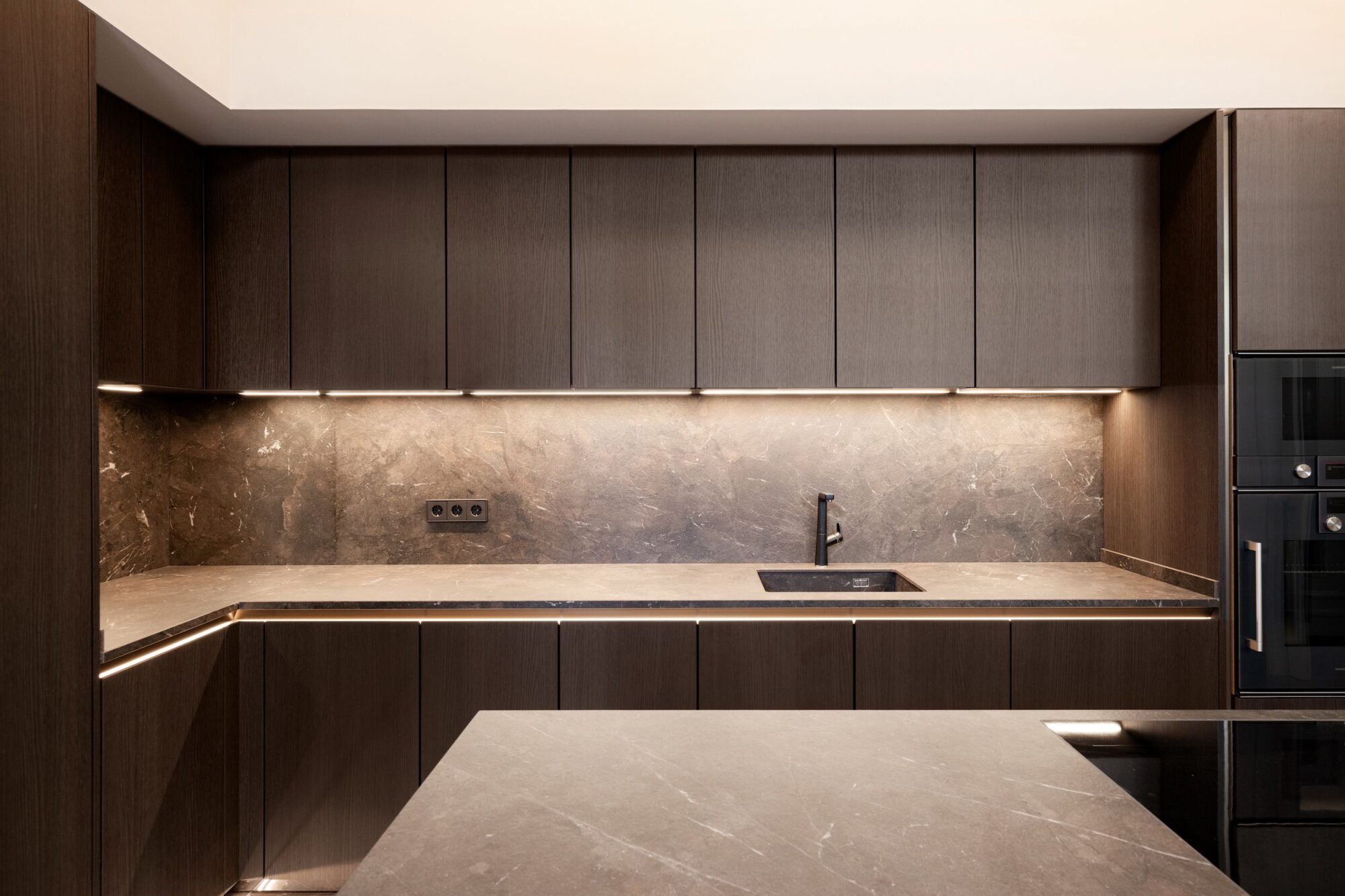 The heart of the home is a double-height entrance leading into spacious, open-plan interiors filled with natural light through floor-to-ceiling windows. The Siematic kitchen—equipped with premium Gaggenau appliances—features sliding panels for customizable living. Indoor spaces connect effortlessly to the landscaped garden and outdoor areas.